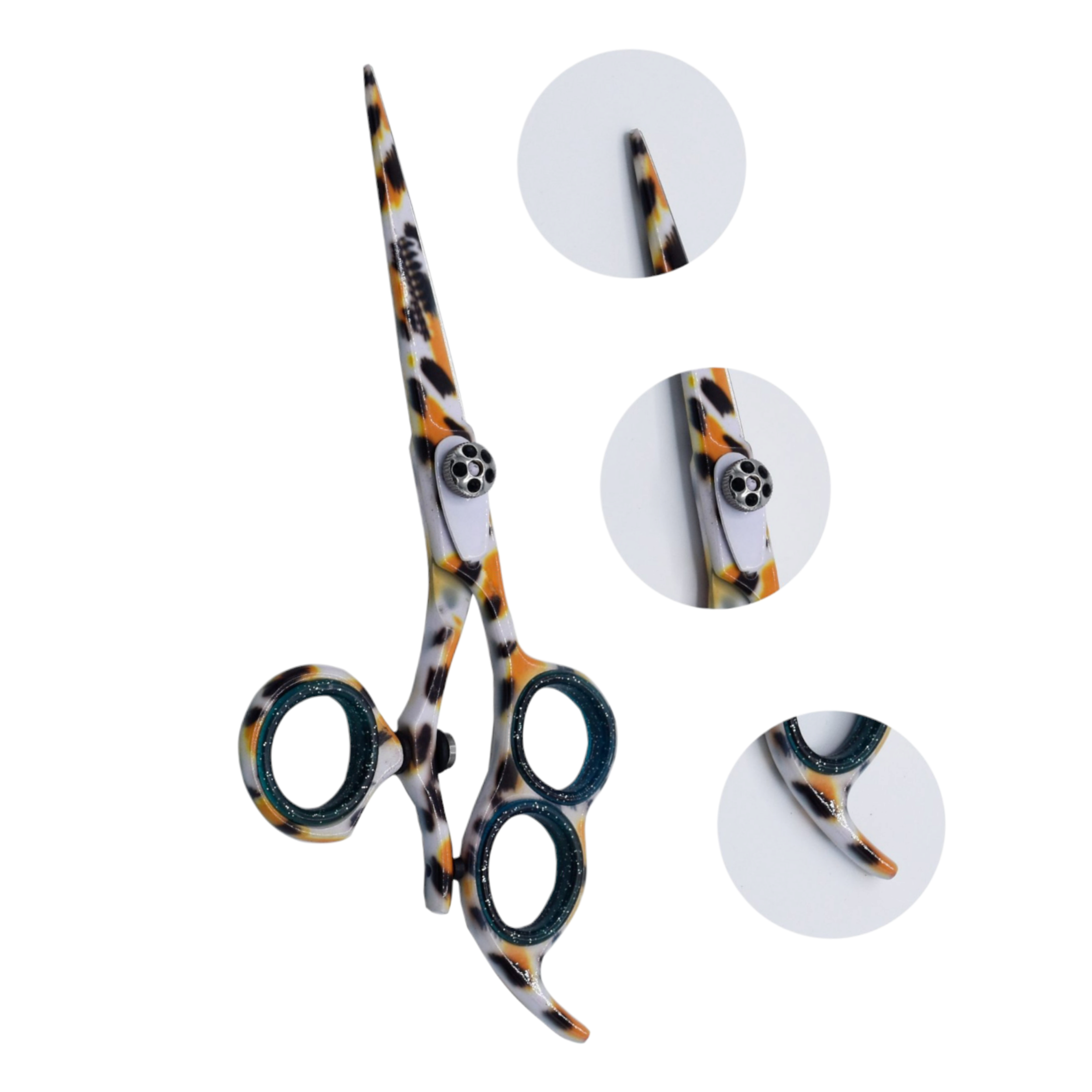 These 6 inches professional hair cutting scissors combine superior functionality with a stylish, leopard style paper coating for a unique and eye-catching design. Equipped with a 360° swivel thumb ring, these scissors offer enhanced control and comfort, allowing for a natural hand position during cutting, reducing wrist strain. The adjustable tension dial ensures optimal performance and precision, while the fixed finger rest provides added stability for a secure grip. Perfect for both professionals and enthusiasts, these high-quality scissors deliver smooth, precise cuts every time. Whether you’re trimming, layering, or styling, these scissors are the perfect tool to elevate your cutting experience.